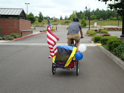 We put the boys in the bike trailer and headed to Clock Tower Park for our town's Fourth of July Parade and Celebration.